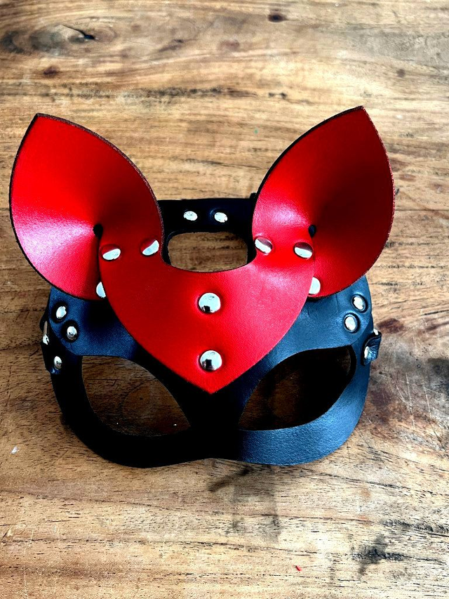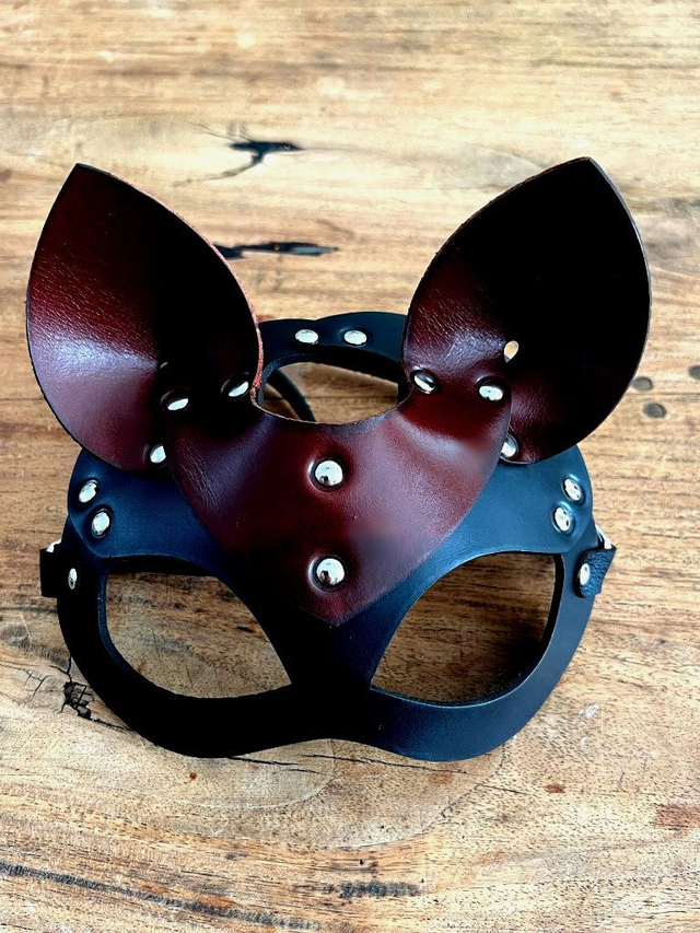 Catmasker van echt tuigleer in verschillende kleuren. Breed 17cm, hoog 17cm. Geschikt voor een hoofdomvang van 52 tot 56cm. Bij de verschillende varianten staat de eerste kleur staat voor het masker en de tweede kleur voor de oortjes. Wenst u een andere maat of andere uitvoering, neem dan gerust contact met ons op. Dit is eigen fabricaat en handwerk.