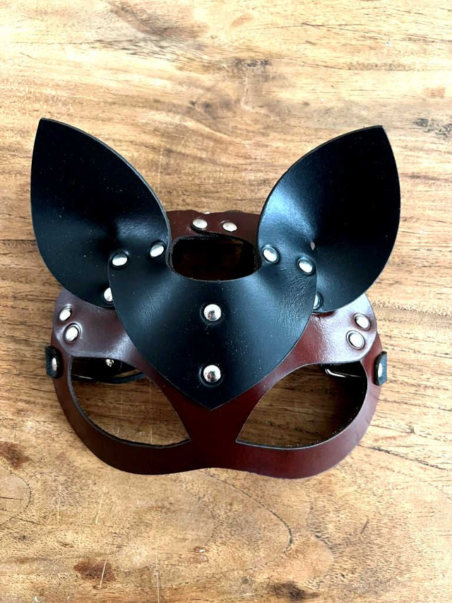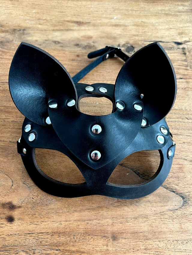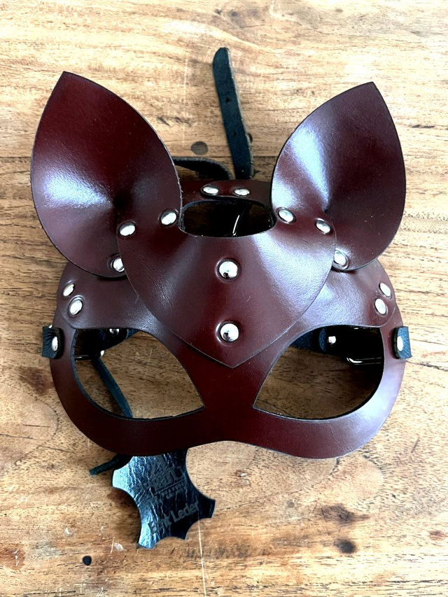Catmasker van echt tuigleer in verschillende kleuren.