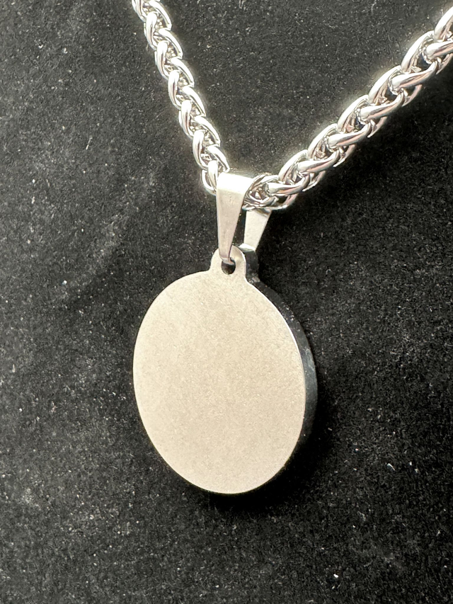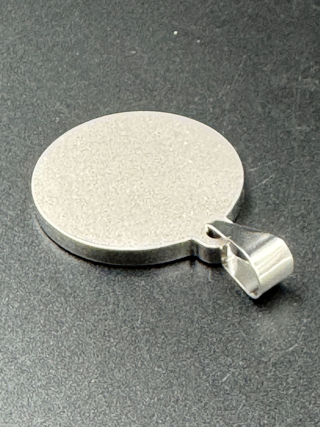 HummDesign. Zware ronde hanger van 30mm rond en 3mm dik van RVS 316L als hanger aan een zwaar collier van 5mm met een lengte van 60cm. Zeer geschikt voor een persoonlijke gravure, die aan één zijde bij de prijs is inbegrepen. Neem contact met ons op wanneer u een persoonlijke lasergravure wenst op dit mooie sieraad.
