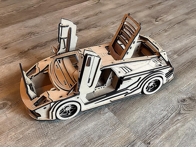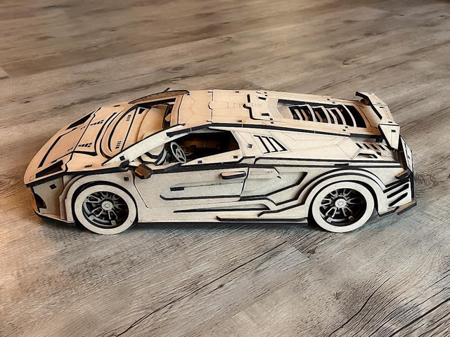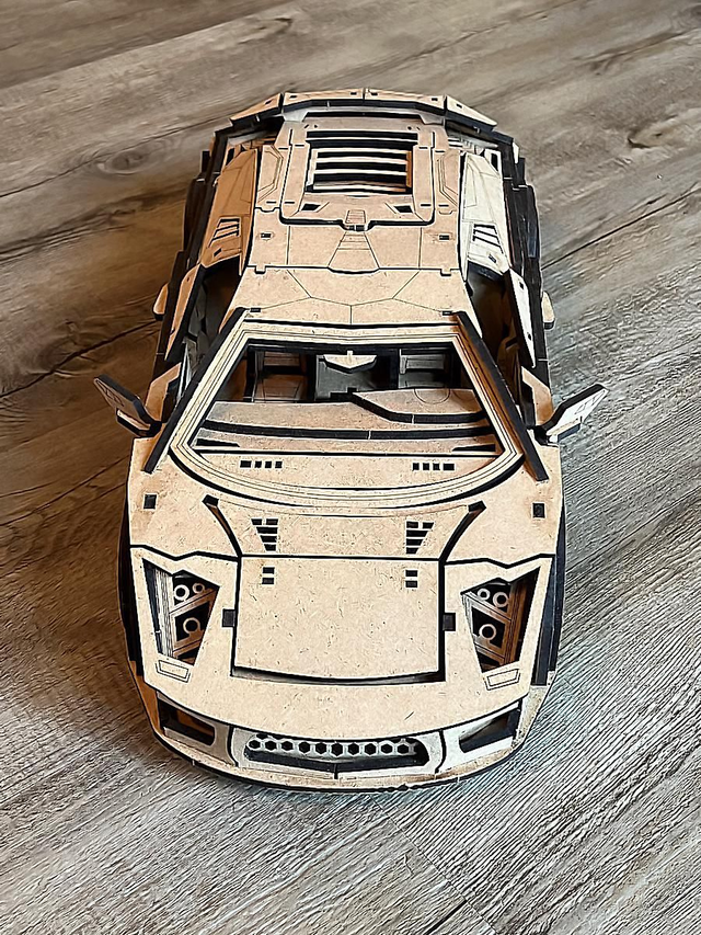 Lamborghini - Op schaal laser-gesneden uit 4mm MDF. Leverbaar geheel gemonteerd zoals op foto of als bouwpakket met een Nederlandse handleiding. (Houtlijm niet inbegrepen). Maat: 42 x 21 x10,5 cm. Gewicht 1300 gram.