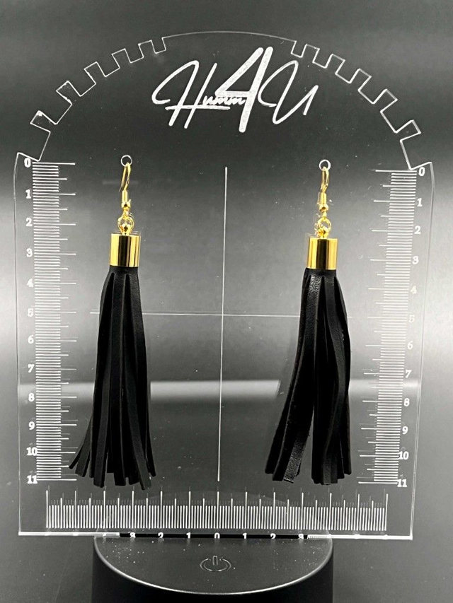 Oorbellen in de vorm van een flogger handgemaakt van echt leer in de kleur zilver met zwart leer en in de kleur goud met zwart leer. Maatvoering 10x80mm.