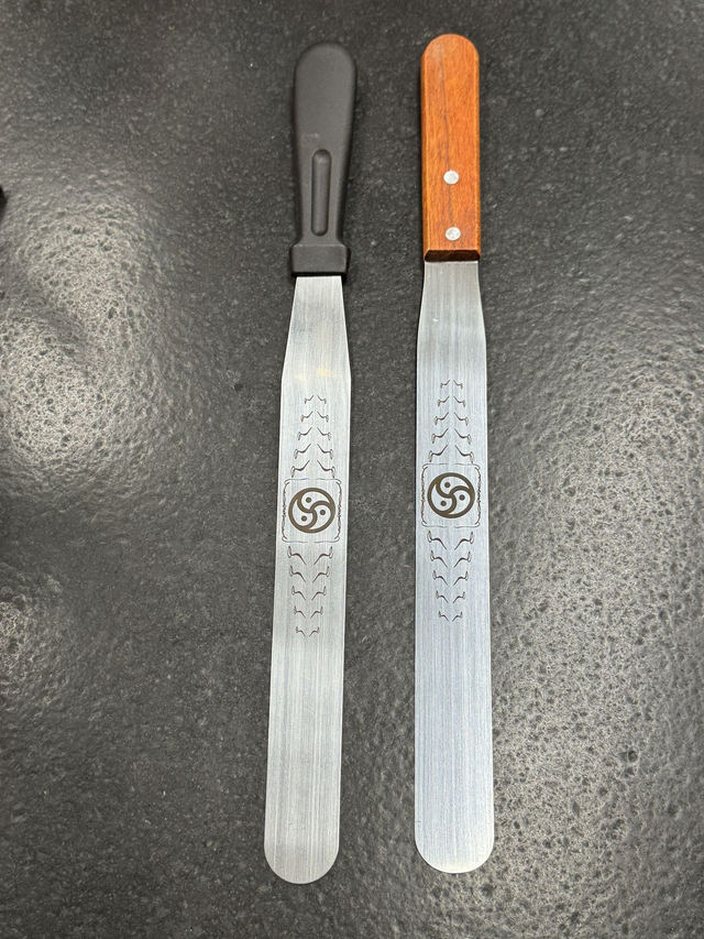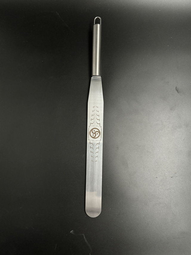 RVS spatel met een handgreep van RVS, kunststof of hout met een totale lengte van 37,5cm. Op het RVS blad van 355x30x1 mm bevindt zich een sierlijke lasergravure met BDSM symbool. Ook leverbaar met een persoonlijke gravure.