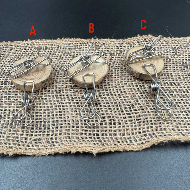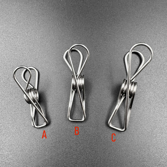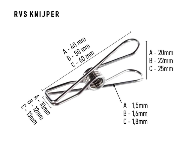 RVS wasknijpers voor het ophangen van kleiner kledingstukken gemaakt van hygiënisch roestvrij metaal. Verkrijgbaar per stuk of in voordeelverpakking van 10 stuks in 3 verschillende maten waaronder A - 40x10x1.5mm of B - 50x12x1.6mm of C - 60x13x1.8mm