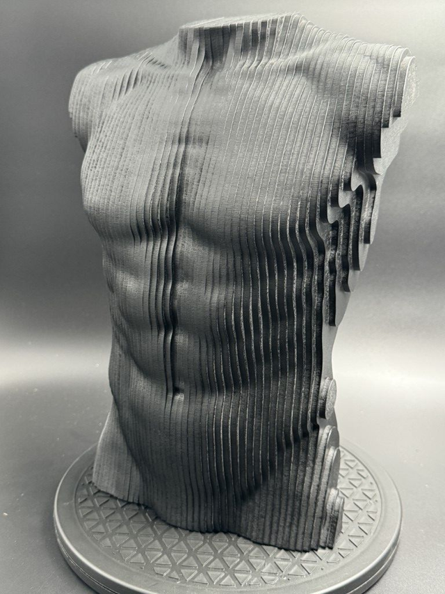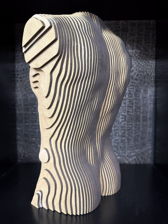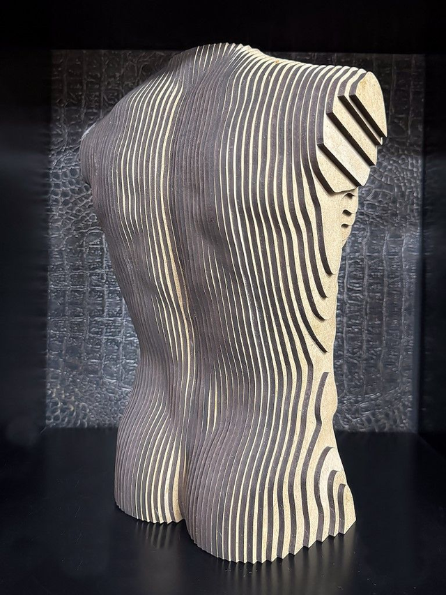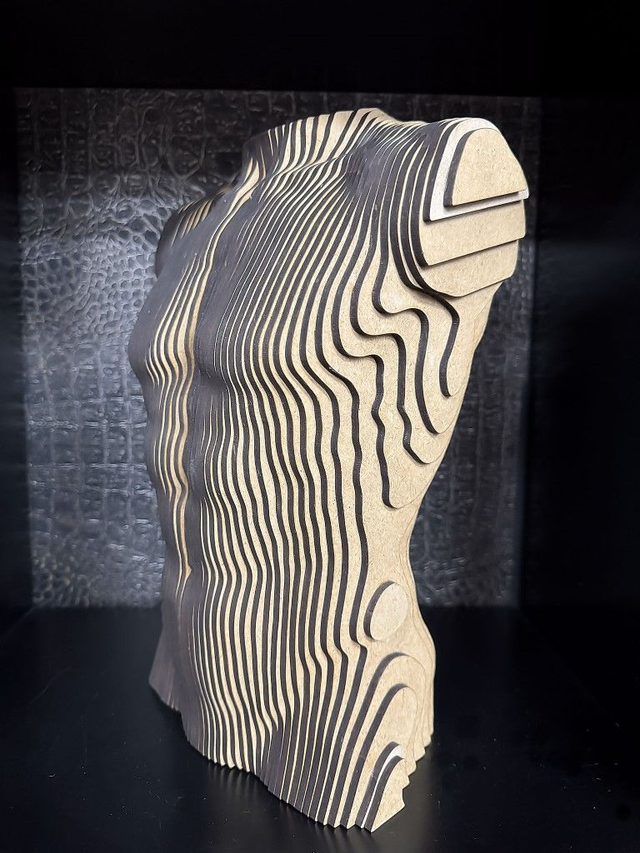Torso Male - Een torso van een mannen bovenlijf gemaakt van 4mm MDF, is leverbaar als bouwpakket met een Nederlandse handleiding, (houtlijm niet inbegrepen) Deze torso is ook gemonteerd leverbaar en zelfs gemonteerd in de kleur zwart of goud gespoten. Dit kunstwerk weegt 4,55 kilo en heeft een maatvoering van 33x23x14,5 cm. Ook op verzoek in andere kleuren leverbaar. Voor meer informatie, neem contact met ons op via de website van Humm4U.com